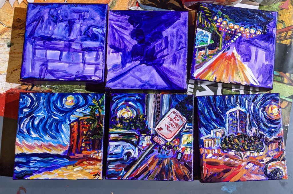 Tuesday 6/29 – gouache pot, island starry nights (underpainting x6, 3.5 complete), Miraflores start