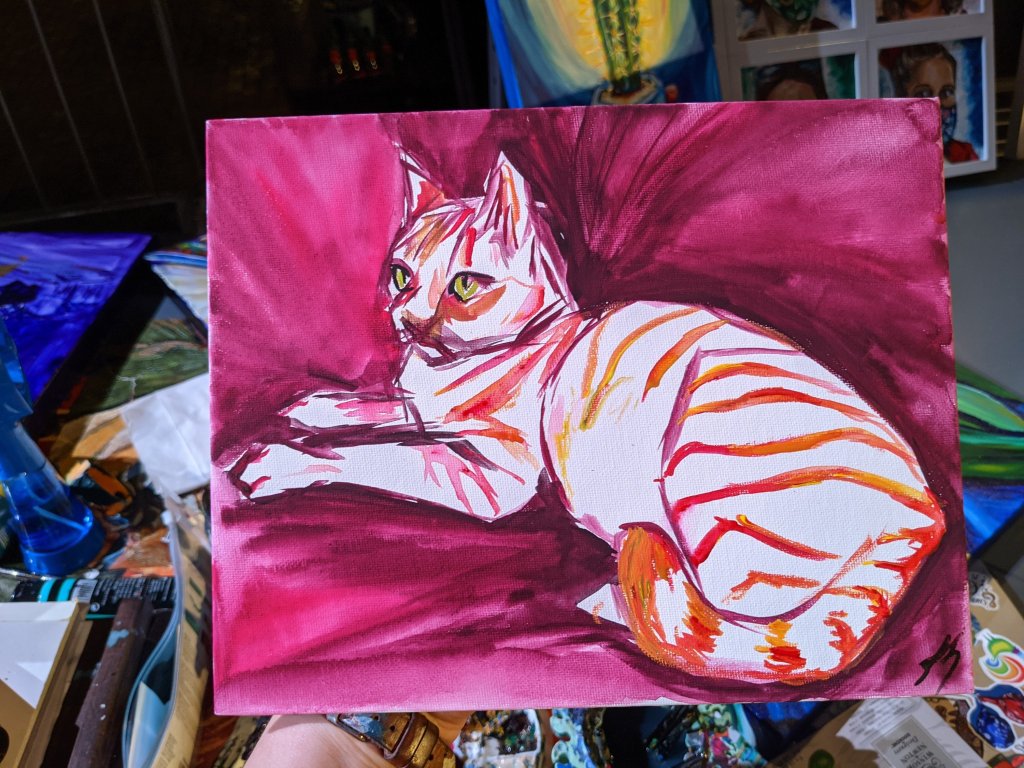 Sunday 7/4 – 11×14 Van Gogh flowers: irises, daisies, zinnias, cornflowers; Gouache cat & Paolo
