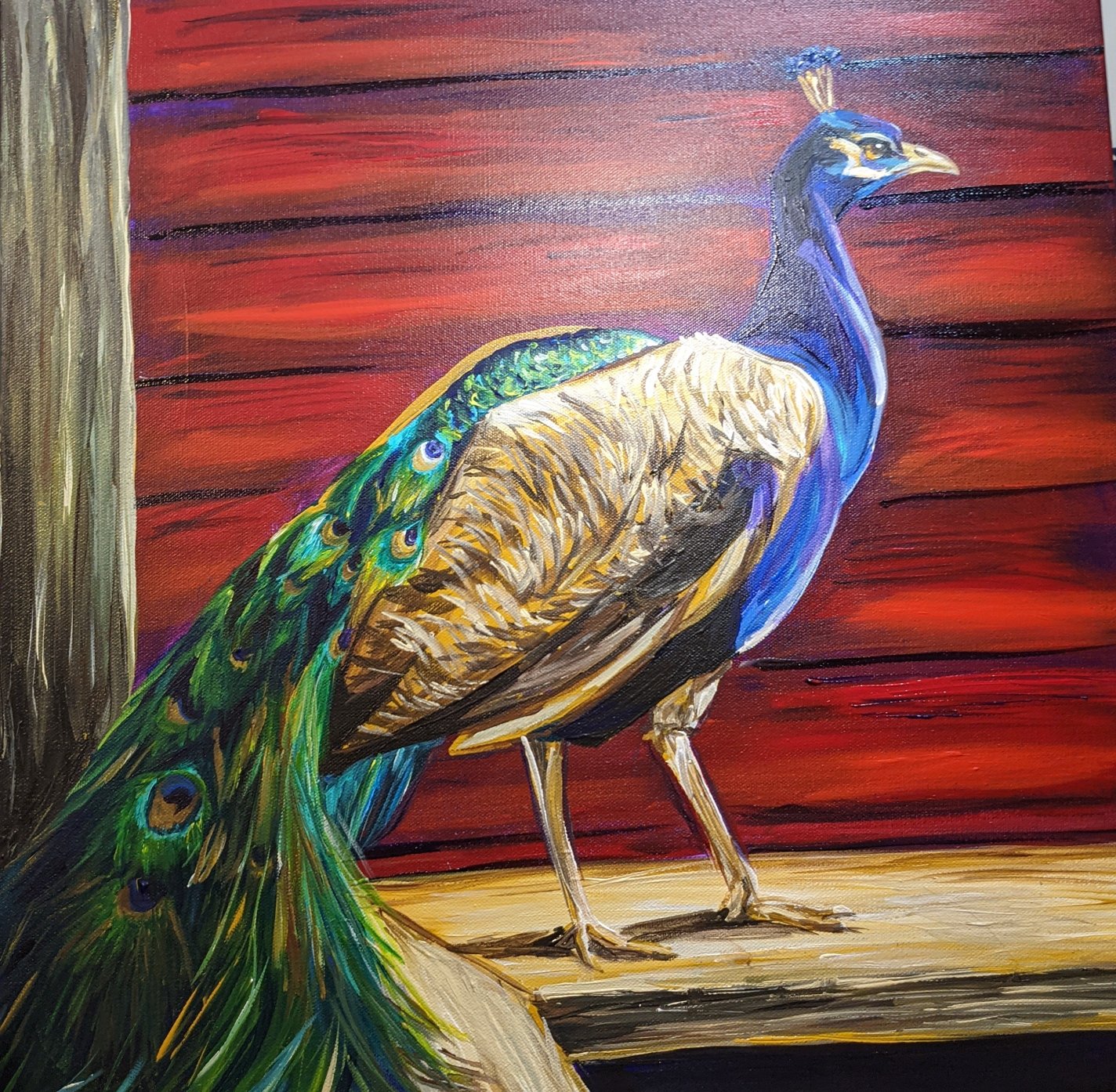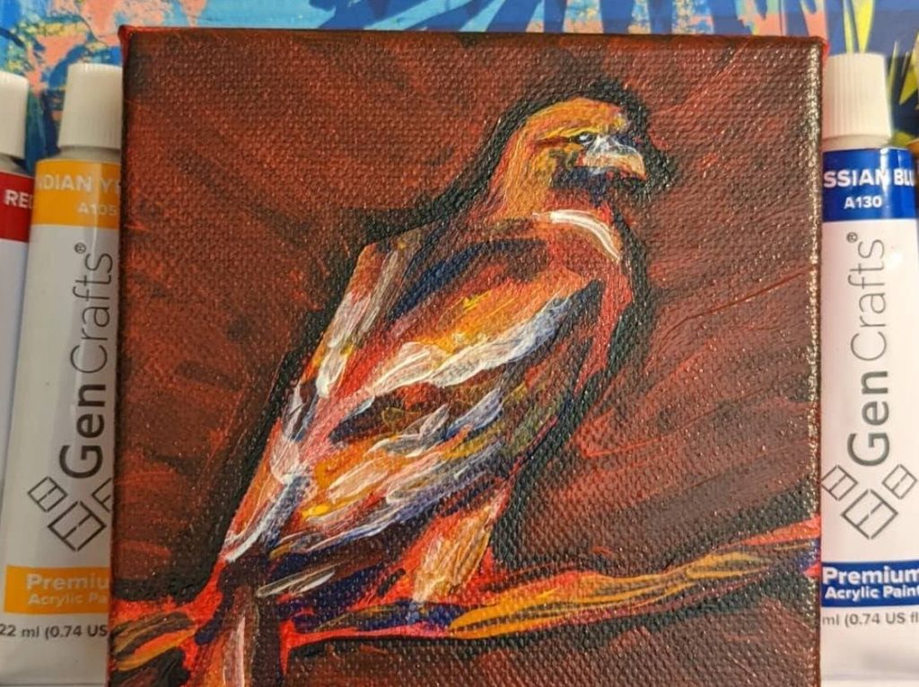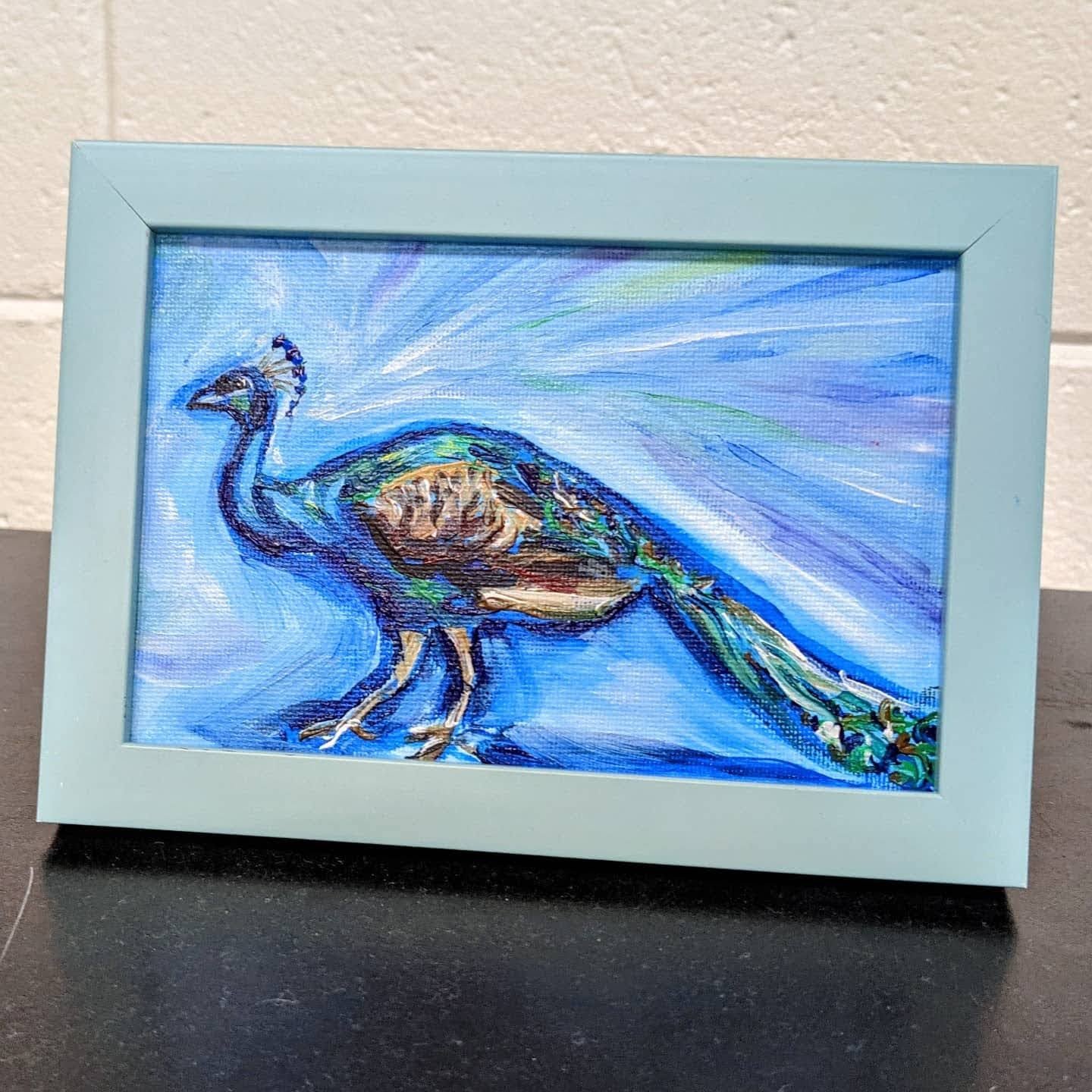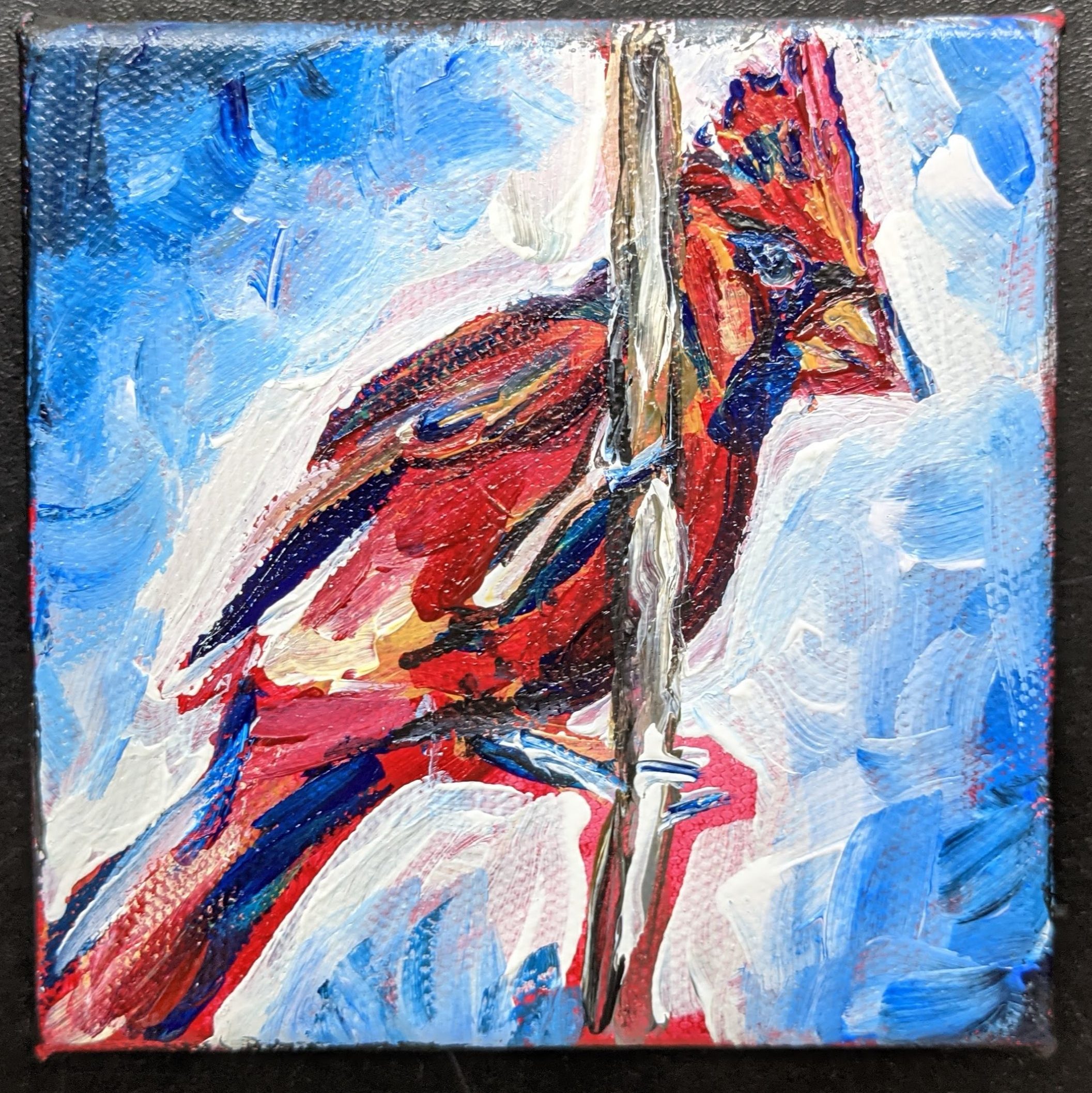 “Hummingbird” 3″ x 3 ” acrylic on stretched canvas, $30 “Spooky Owl” 6″ x 6″ acrylic on stretched canvas SOLD“Hawk” 3″ x 3″ acrylic on stretched canvas, $30“Cardinal” 3″ x 3″ acrylic on stretched canvas $30“Peacock” 4″ x 6″ framed acrylic