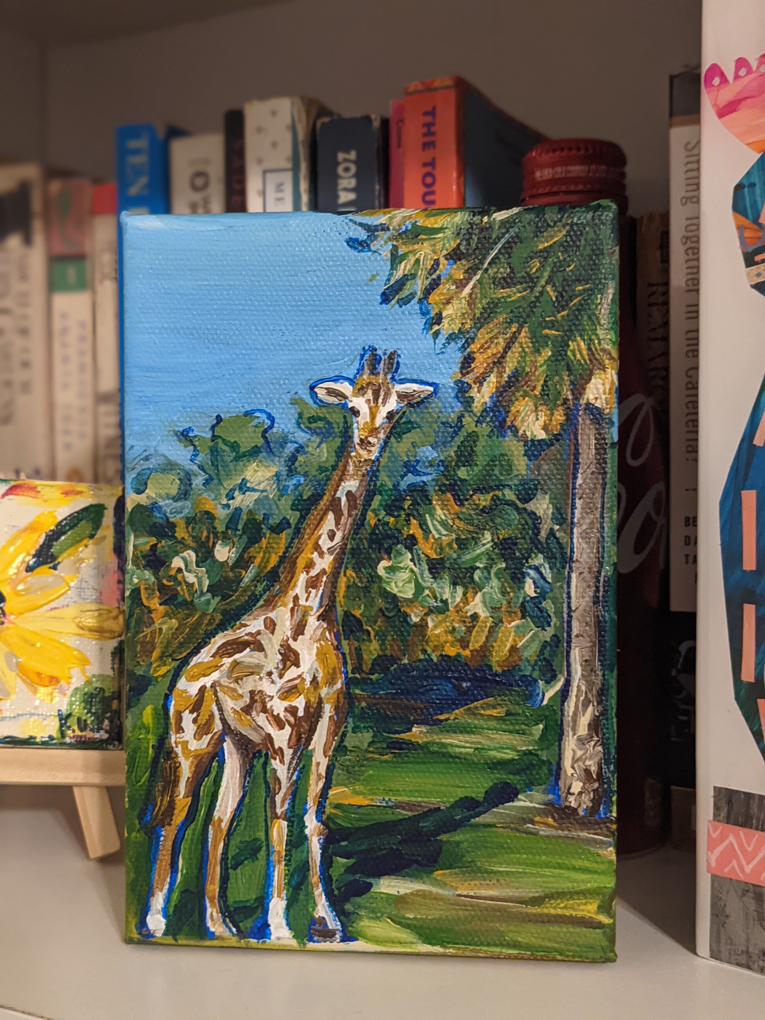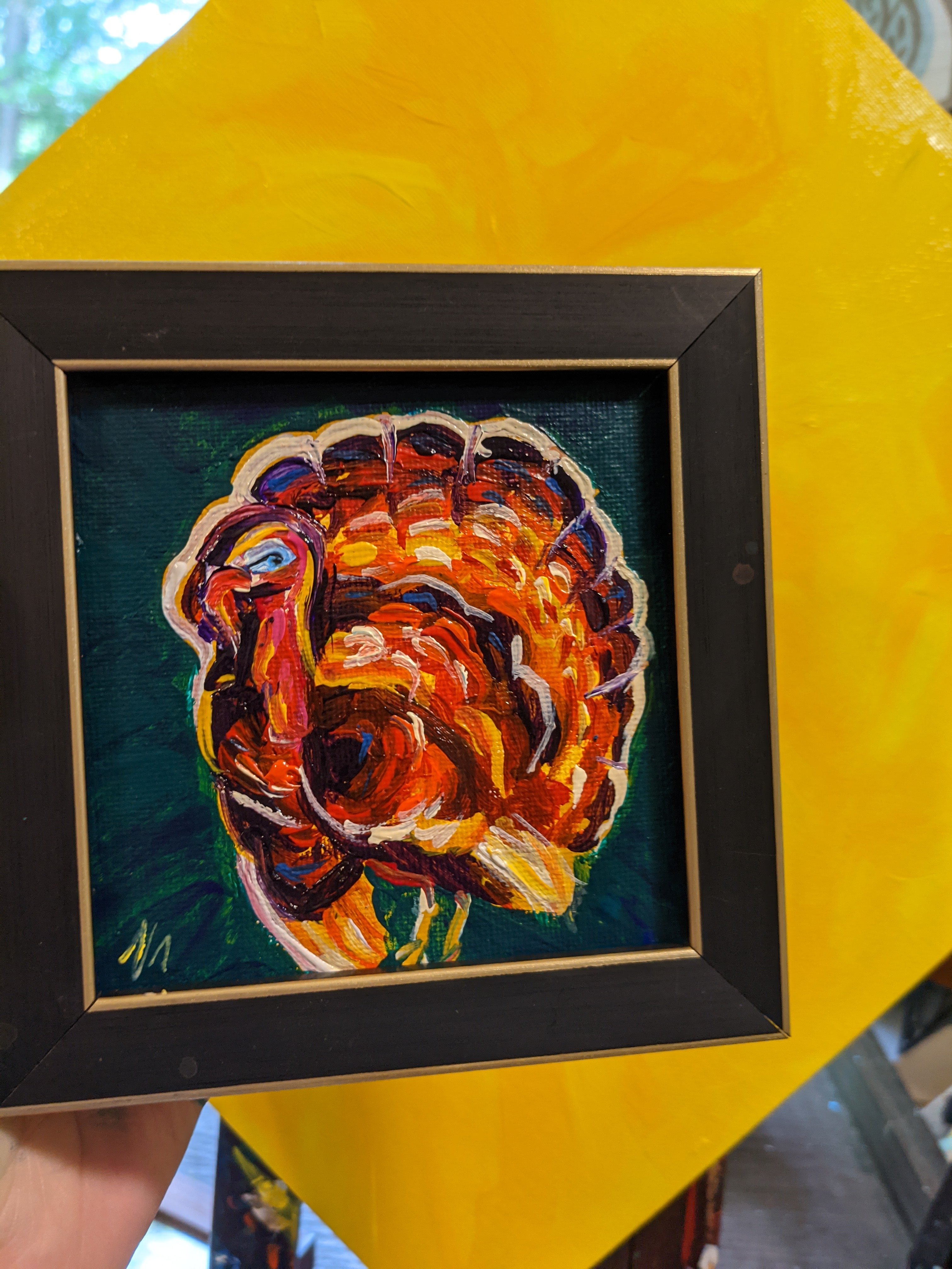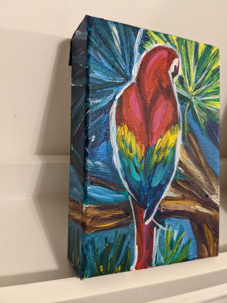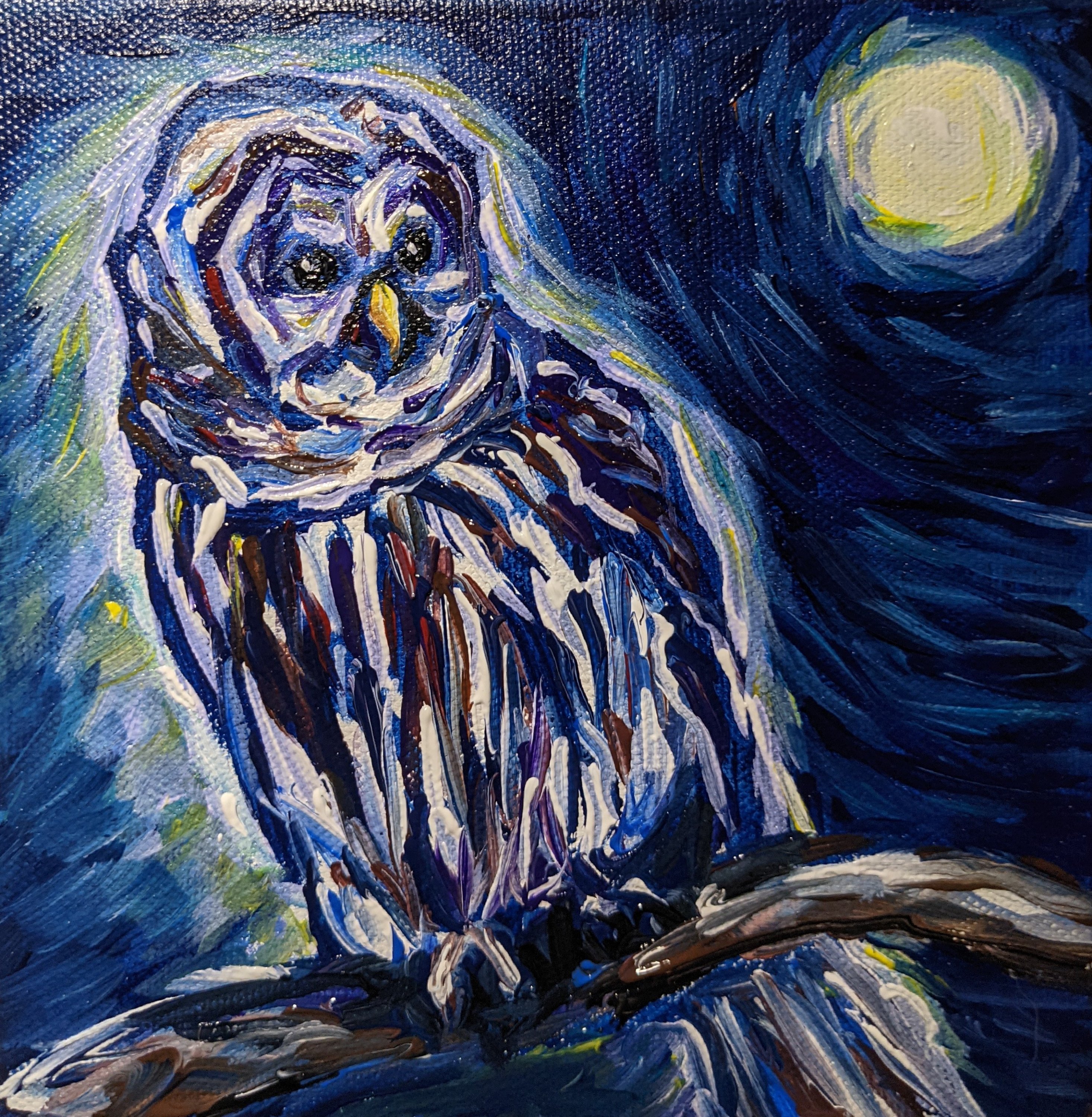 “Hummingbird” 3″ x 3 ” acrylic on stretched canvas, $30 “Spooky Owl” 6″ x 6″ acrylic on stretched canvas SOLD“Hawk” 3″ x 3″ acrylic on stretched canvas, $30“Cardinal” 3″ x 3″ acrylic on stretched canvas $30“Peacock” 4″ x 6″ framed acrylic