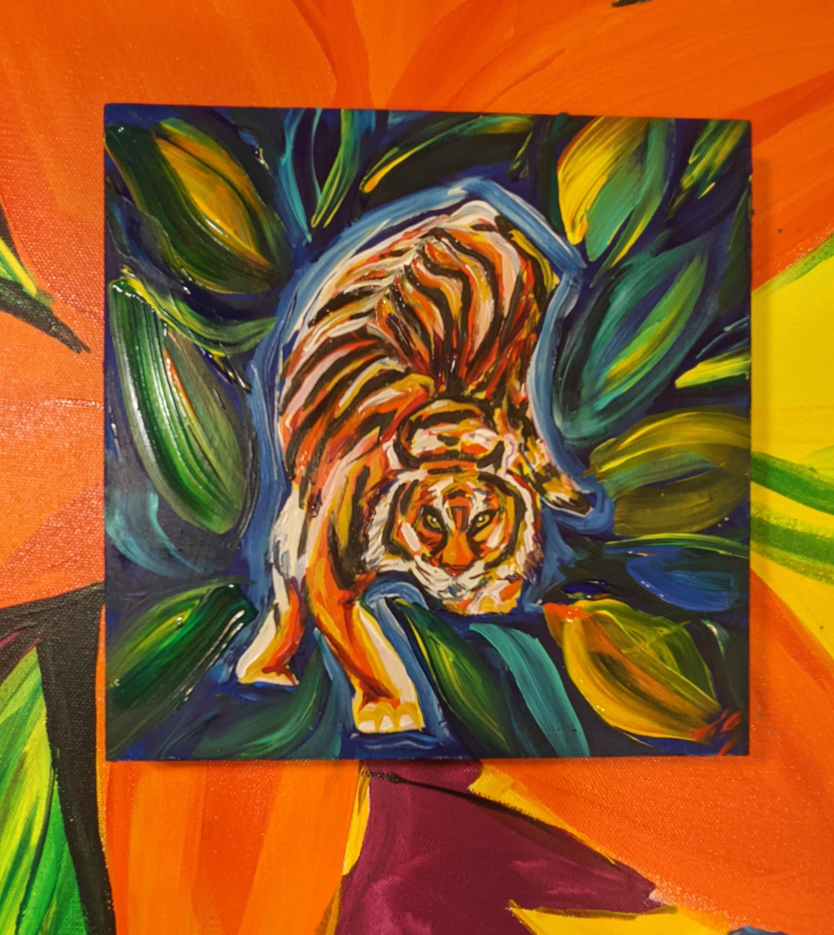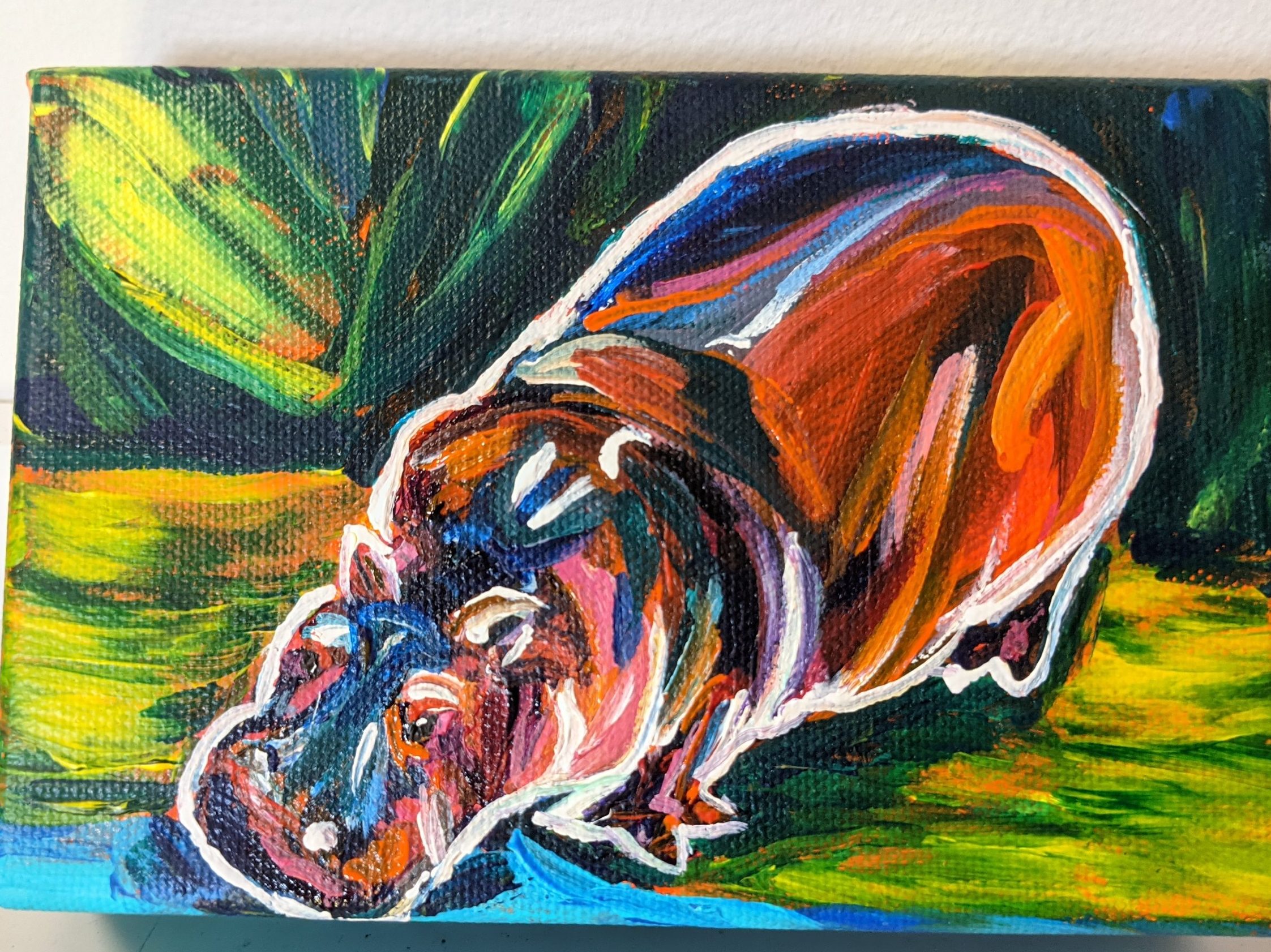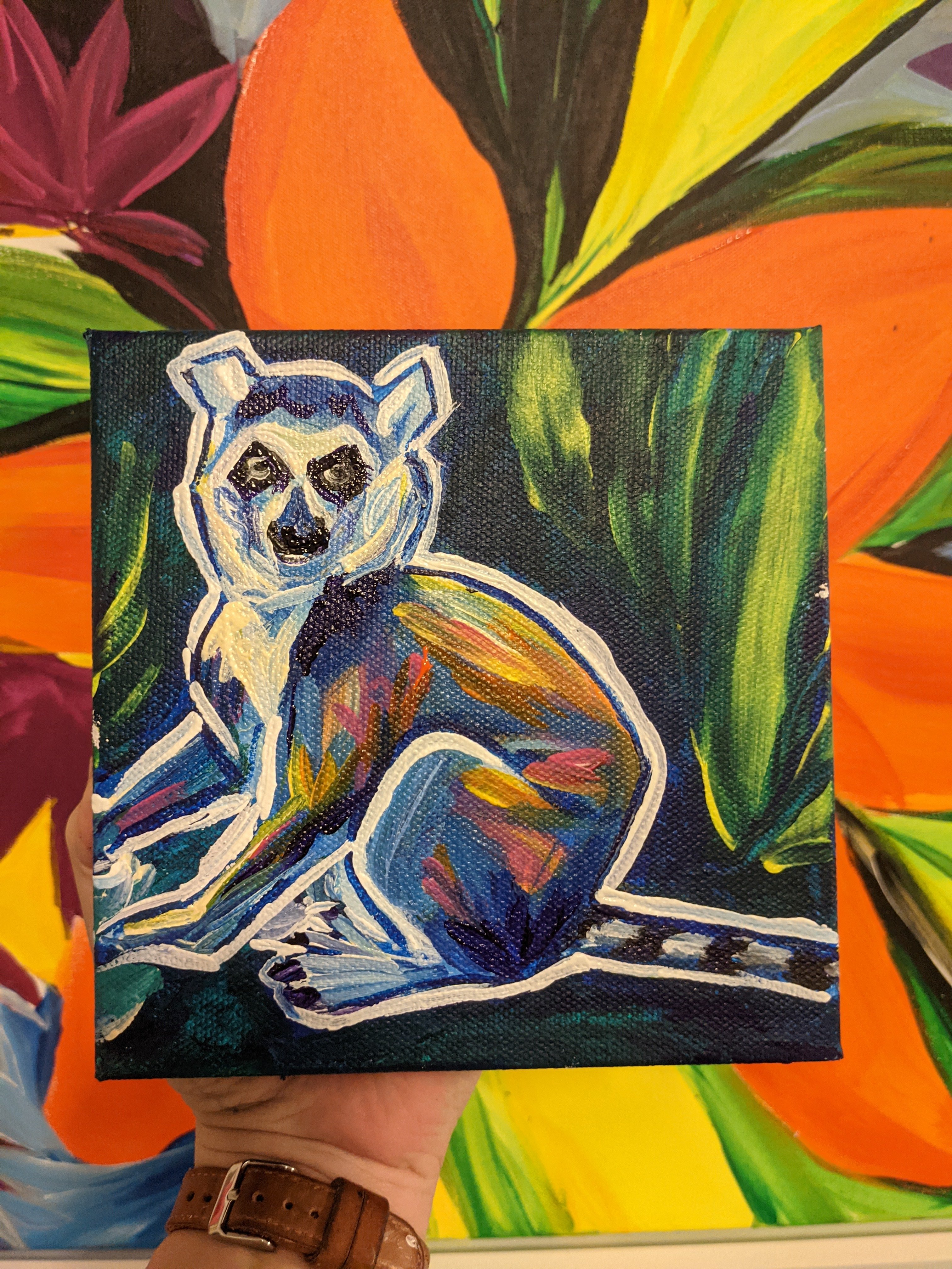 “Turkey” framed 3′ x 3″, acrylic SOLD “Tiger” 8″ x 8″, acrylic on wood panel SOLD“Giraffe” 4″ x 6″, acrylic on stretched canvas SOLD” Lemur” 5′ x 5′ acrylic on stretched canvas, SOLD“Macaw Wings” 4″ x 6″ acrylic on stretched canvas, SOLD“Macaw” 4″ x 6″ acrylic on stretched canvas, SOLD“Hippopotamus” 4″ x 6″ acrylic on stretched canvas, SOLD