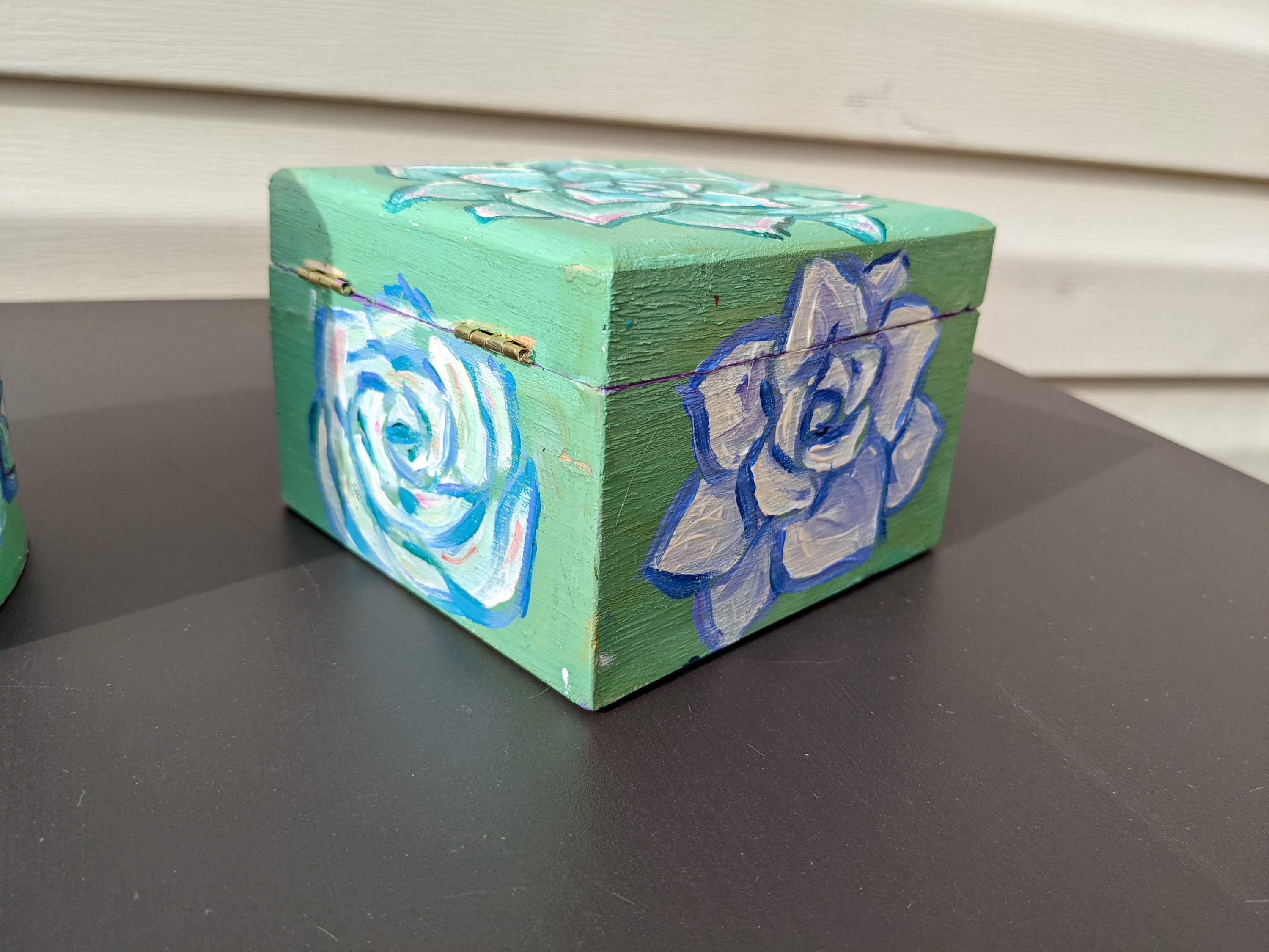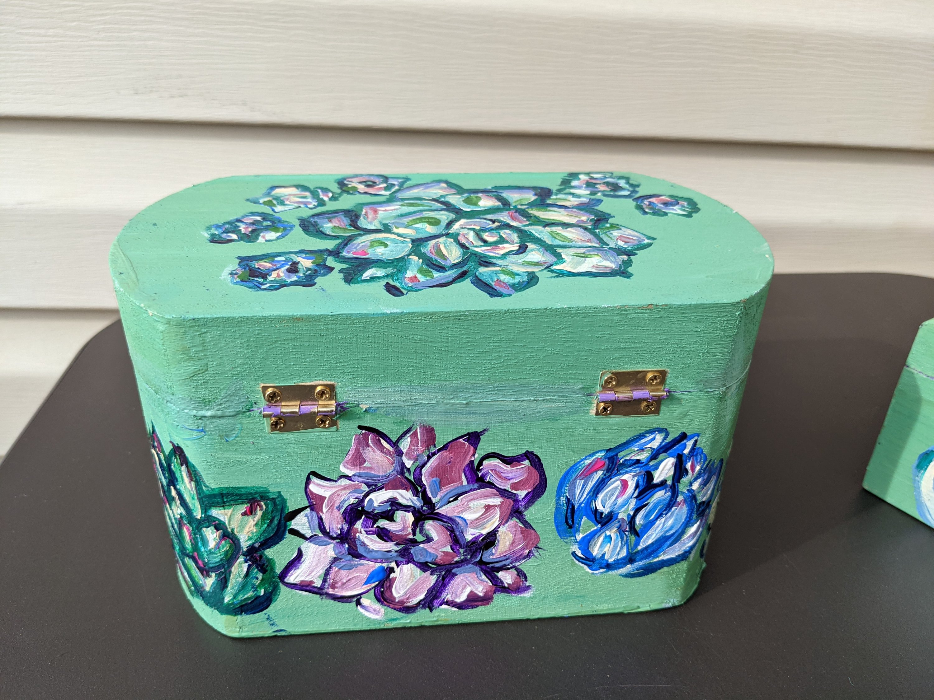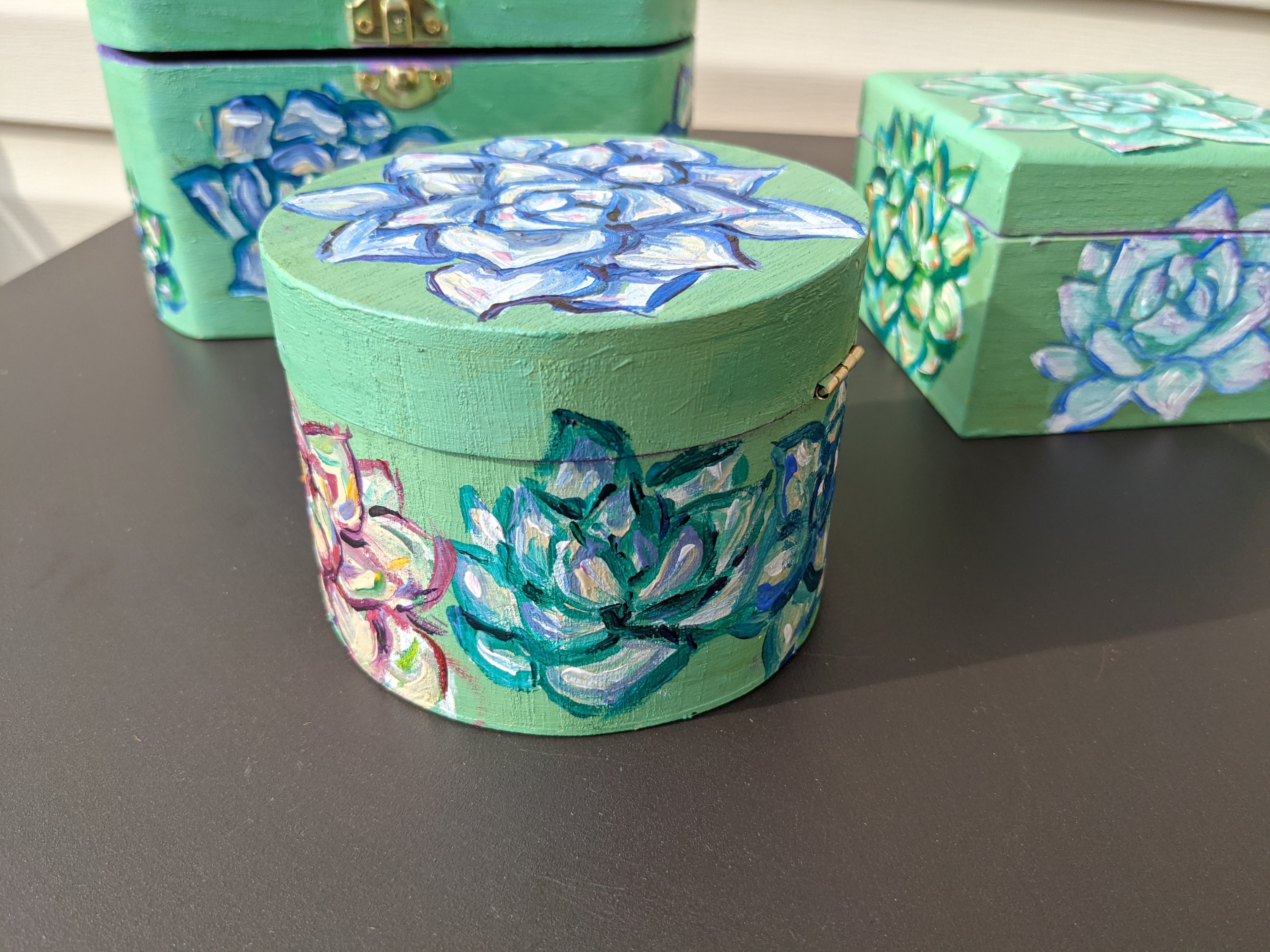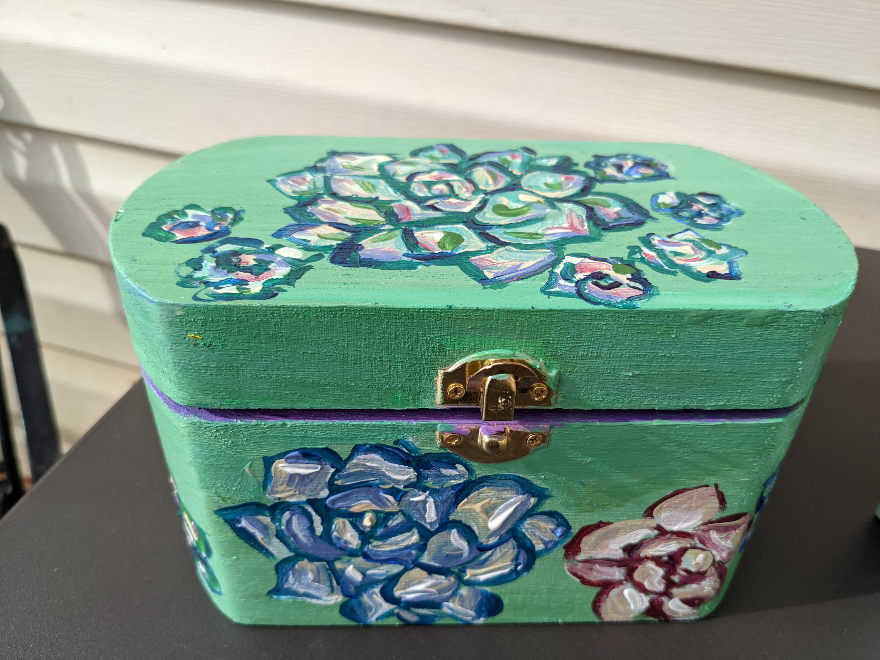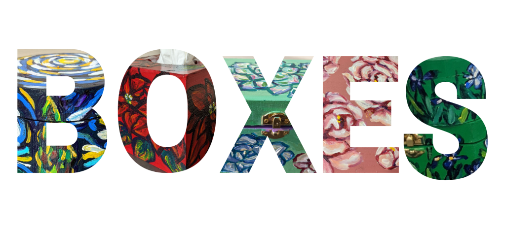 Art should be everywhere, don’t you think? So I have been experimenting with different surfaces like this wooden boxes.