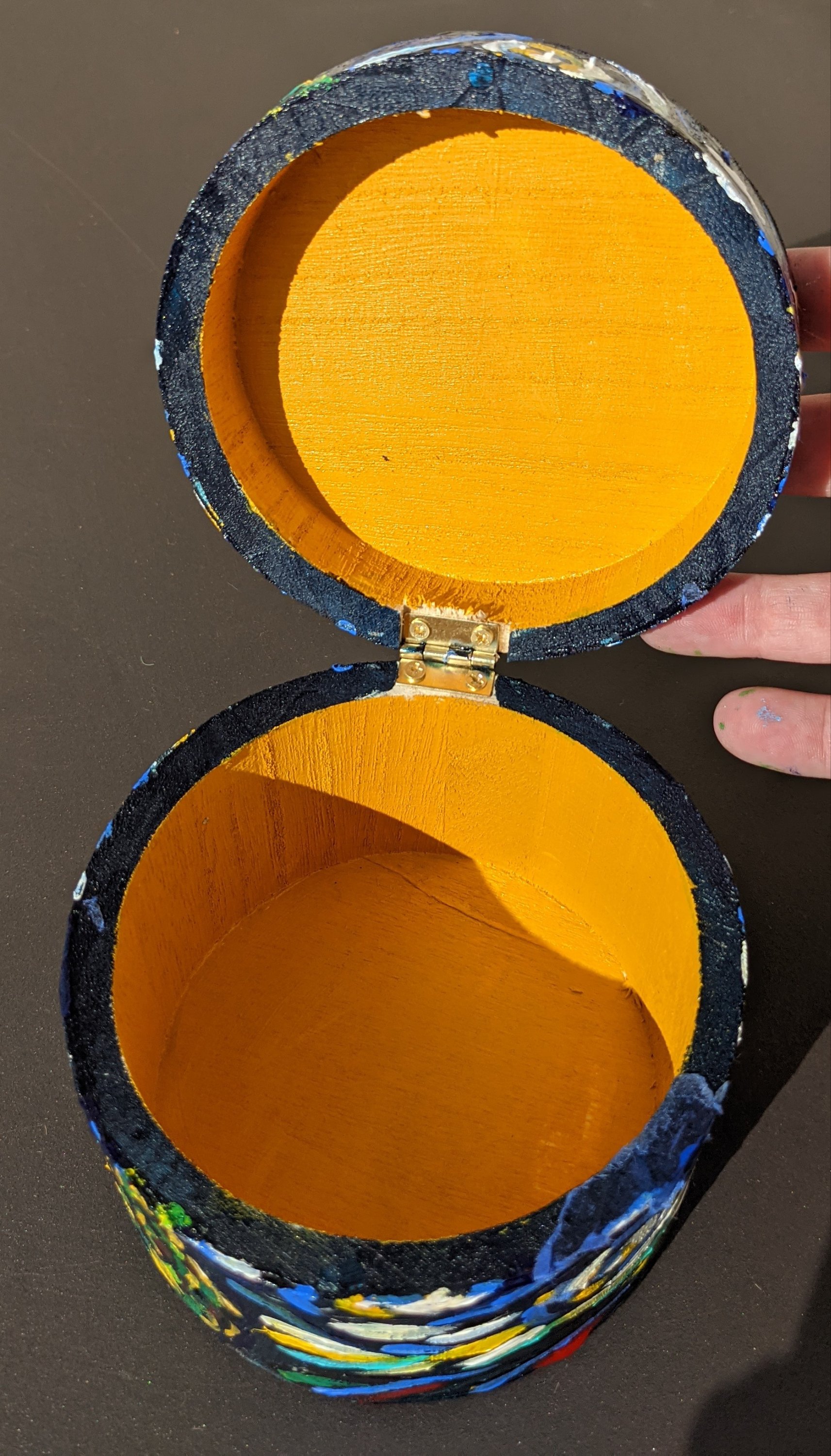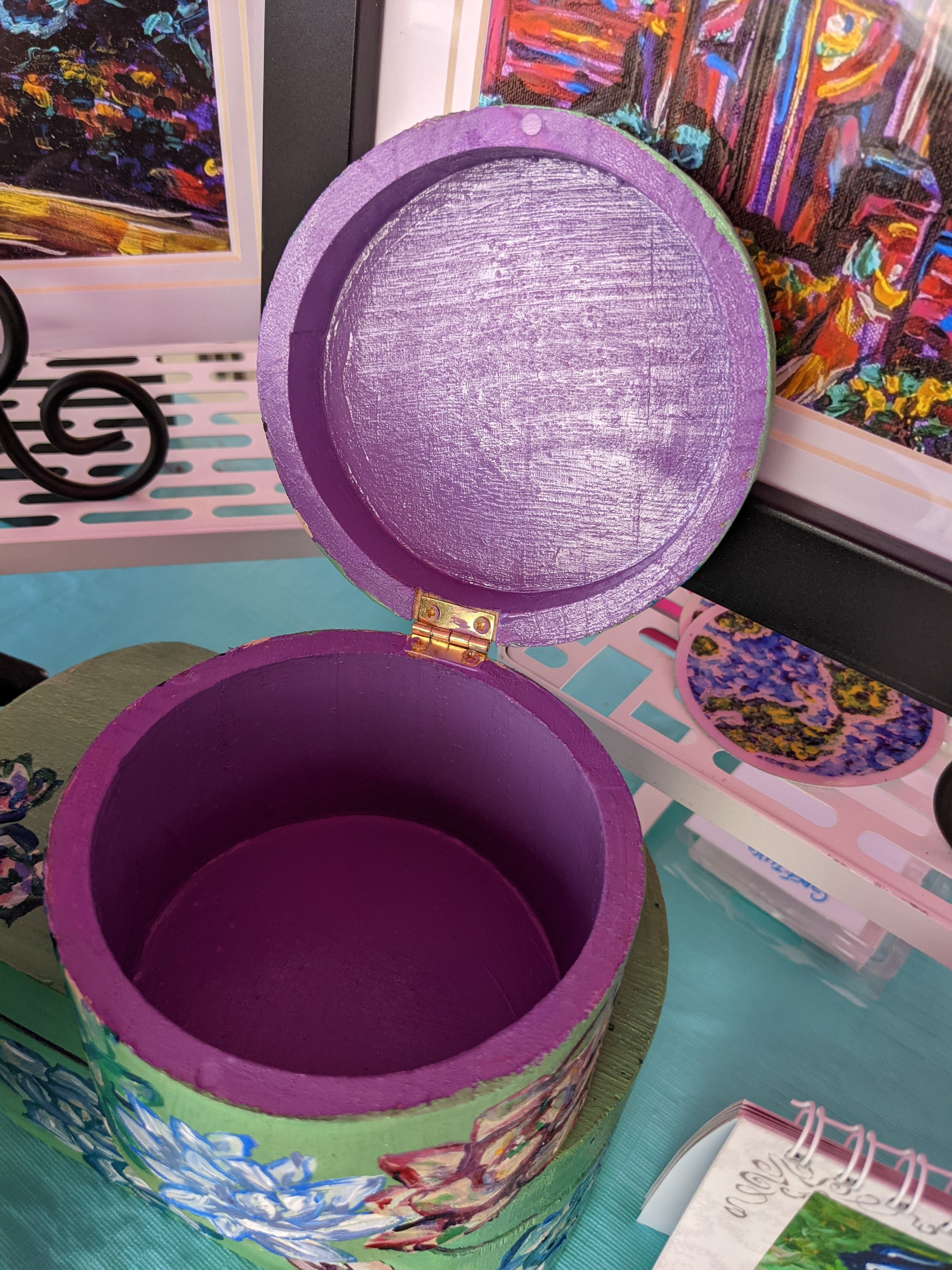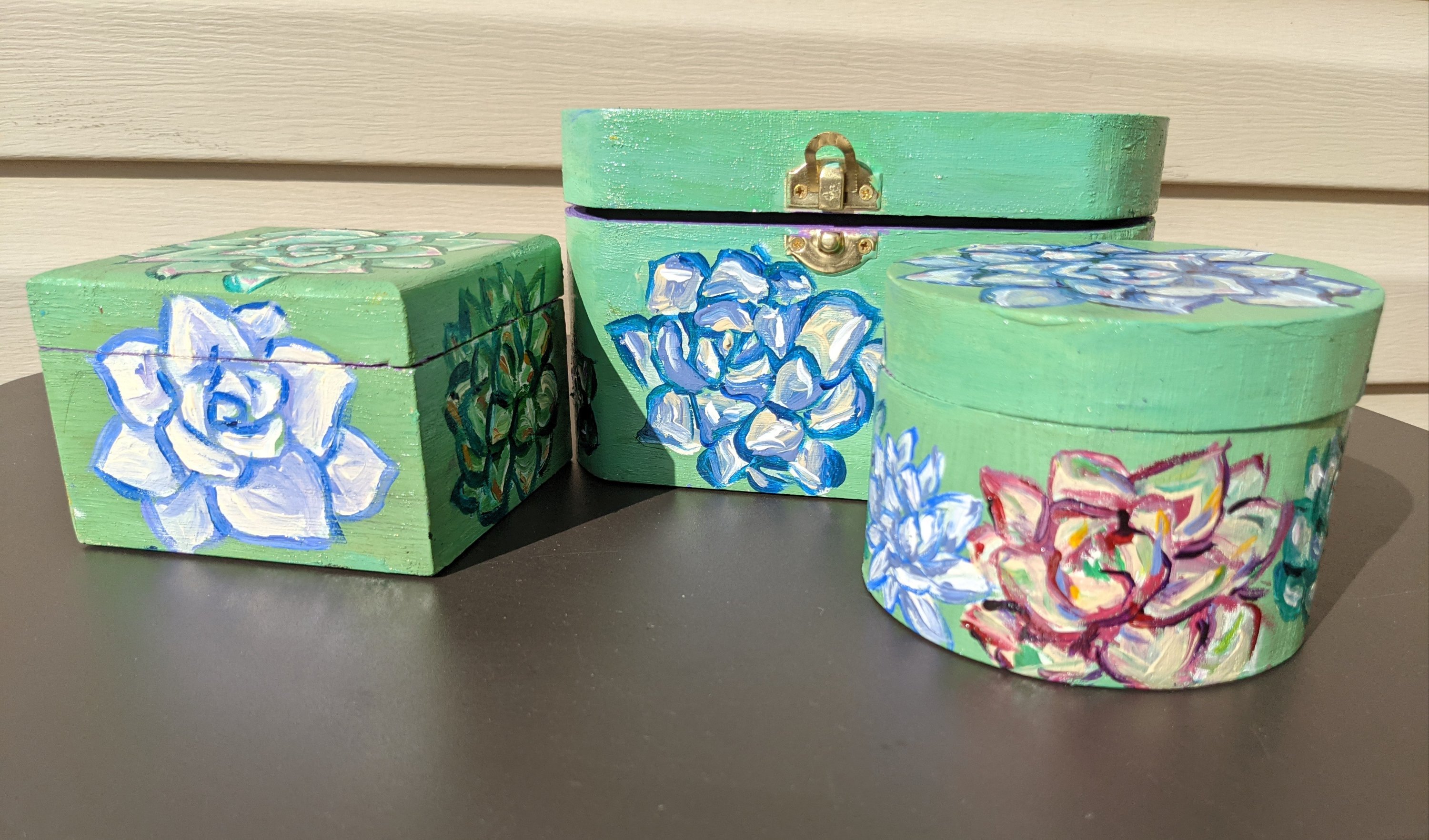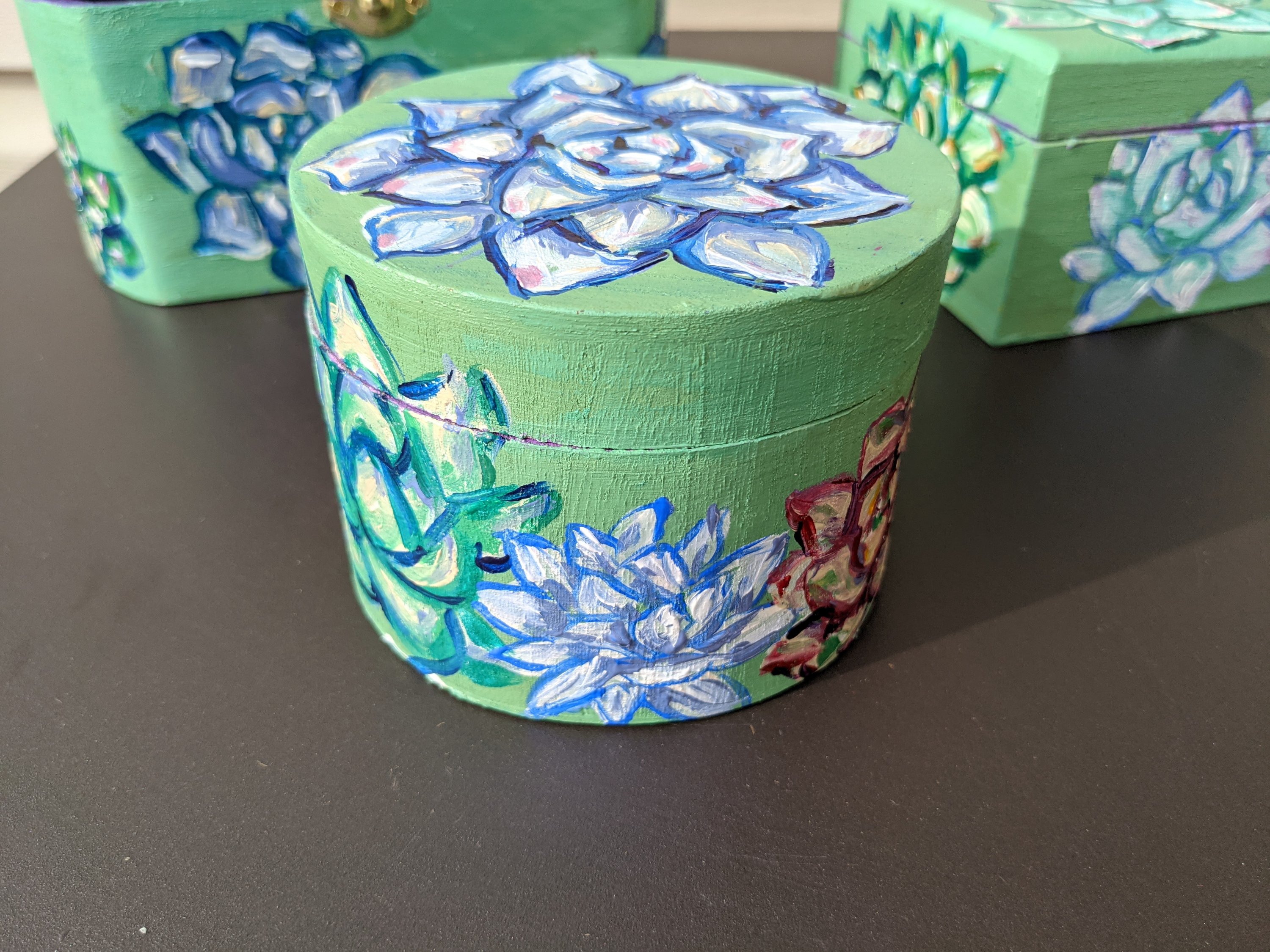 Art should be everywhere, don’t you think? So I have been experimenting with different surfaces like this wooden boxes.